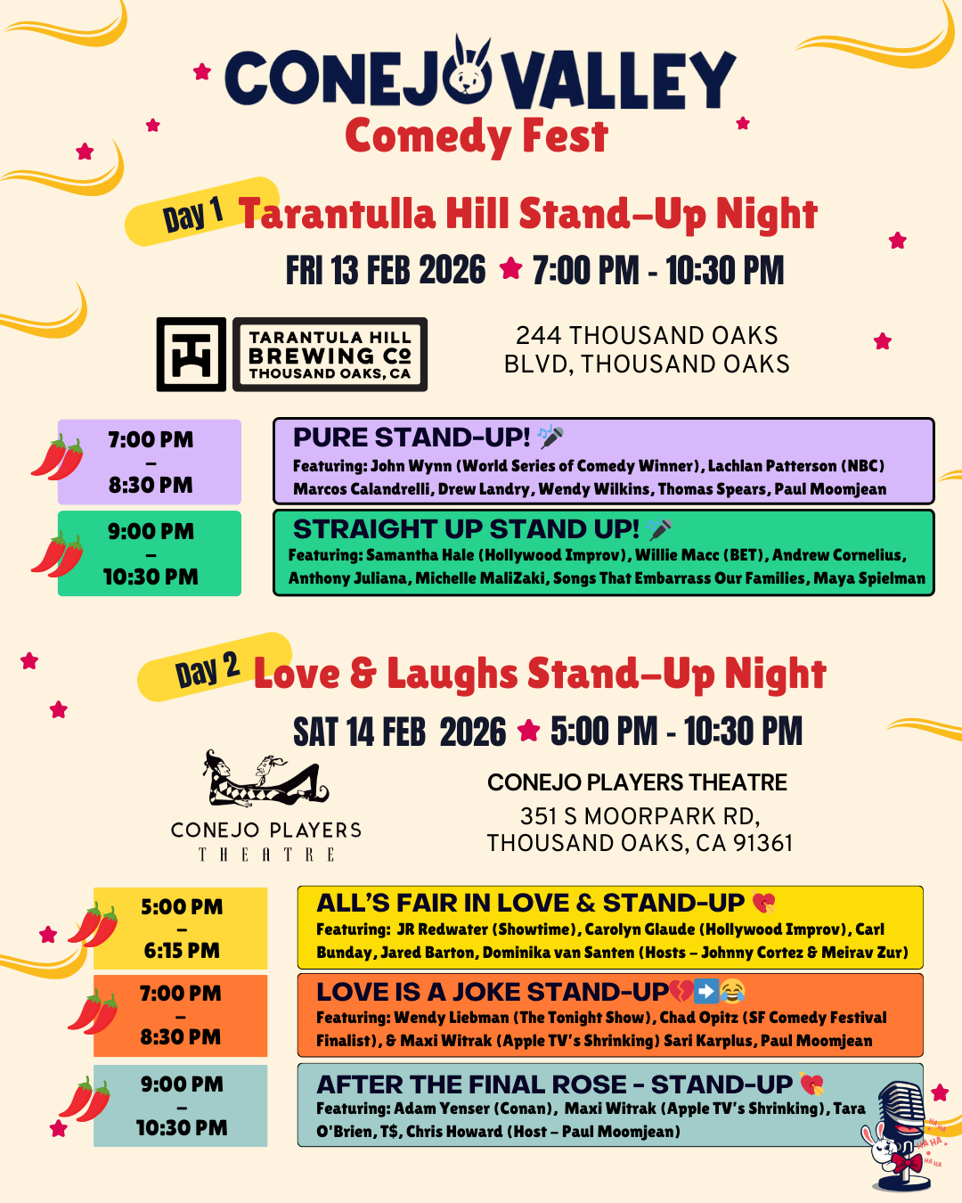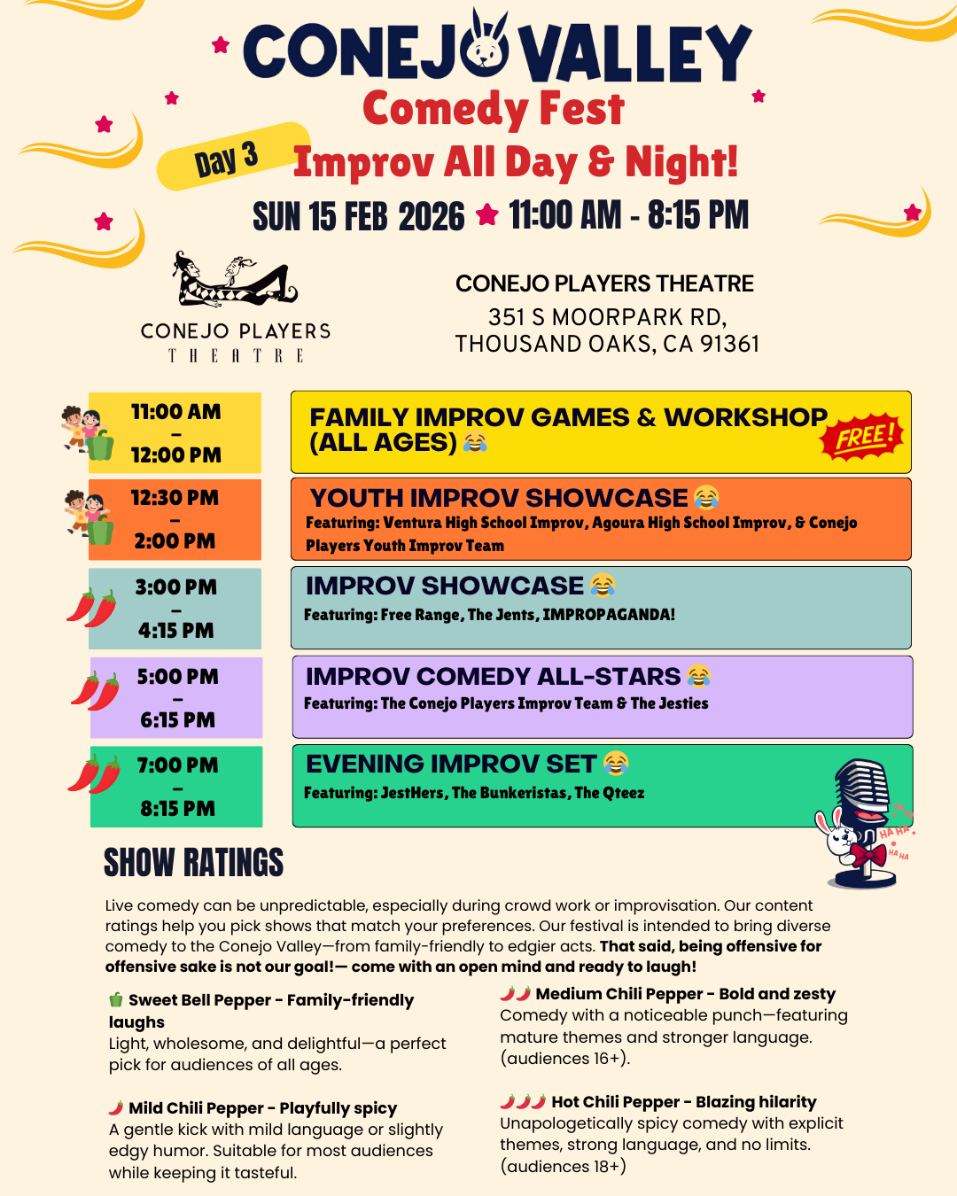 The Conejo Valley Comedy Festival is a community-driven event created to celebrate comedy in all its forms, bringing together comedy fans of all ages, for two days of joy, laughter, and connection.